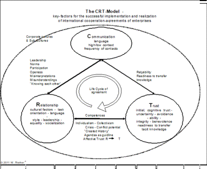 CRT Model - Cultural factors determining cooperative activities Keywords: Cooperation, cultural factors, CRT The CRT model is a theoretical framework describing the interrelation between three key cultural factors that determine the quality and sustainability of cooperative outcomes. The acronym CRT stands for Communication (C), Relationship Management (R), and Trust (T). The model is based on scientific research[i], which demonstrates that the effects of cultural factors are well-established, and that all other factors influencing cooperation depend on the quality of these three core components. Definition and Importance of Cooperation Sociologists define cooperation as a fundamental[ii] aspect of societies and of interactions between organisms, groups, and communities. While selfish behavior exists in nature, species and systems that rely on cooperation and mutual support have historically prevailed. Conversely, purely egoistic strategies may lead to the elimination of partners or even the self-destruction of the actor. The